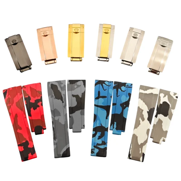 Elevate your Rolex with our Camo Rubber Strap, designed specifically for the Submariner, Daytona, GMT, and Yacht-Master. This stylish strap features a unique camouflage pattern that adds a bold touch to your watch while ensuring comfort and durability.